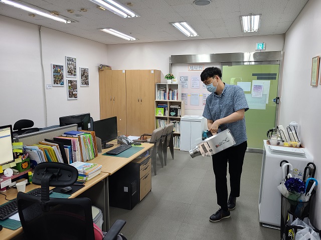 코로나19 예방을 위해 매일 수시로 방역을 진행하고 있습니다. 페이지 정보 작성자 관리자 댓글 0건 조회 2,639회 작성일 20-06-09 00:21 목록 본문 페이스북 공유 트위터 공유 구글+ 공유 이전글장애인가족자조모임 "다함께 차차차: 7월 13일 현장 스케치 20.07.14 다음글구리시장애인가족지원센터는 코로나19 확산방지를 위해 자체방역을 하고 있습니다. 20.04.03