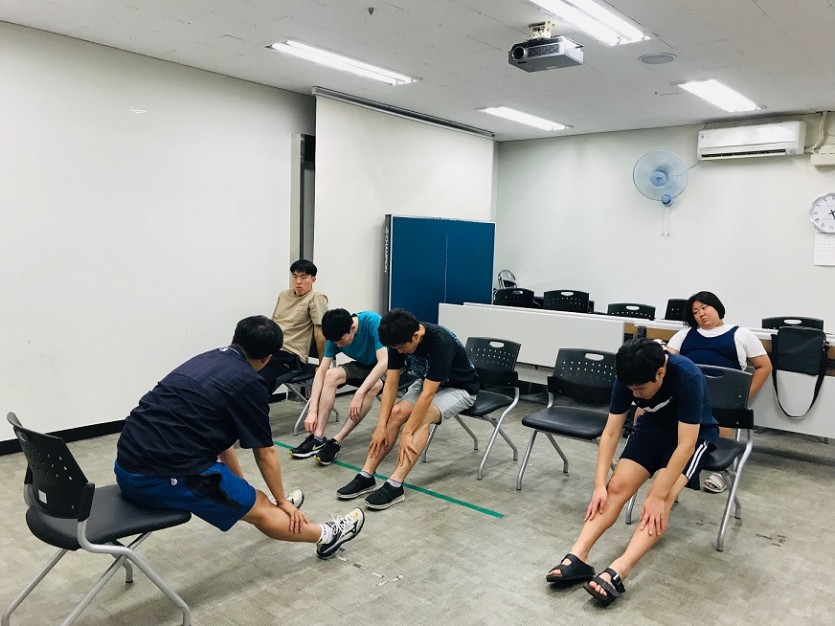 장애인 생활체육 프로그램 13회기 진행하였습니다. 간단한 체조, 스트레칭과 마커판을 활용하여 제자리 멀리뛰기, 환궁 게임규칙 알아보기 직접 해보기등 진행하였습니다~^^