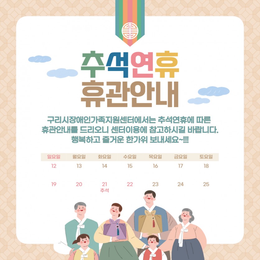 2021. 추석에 따른 구리시장애인가족지원센터 휴관 안내 > 센터알림