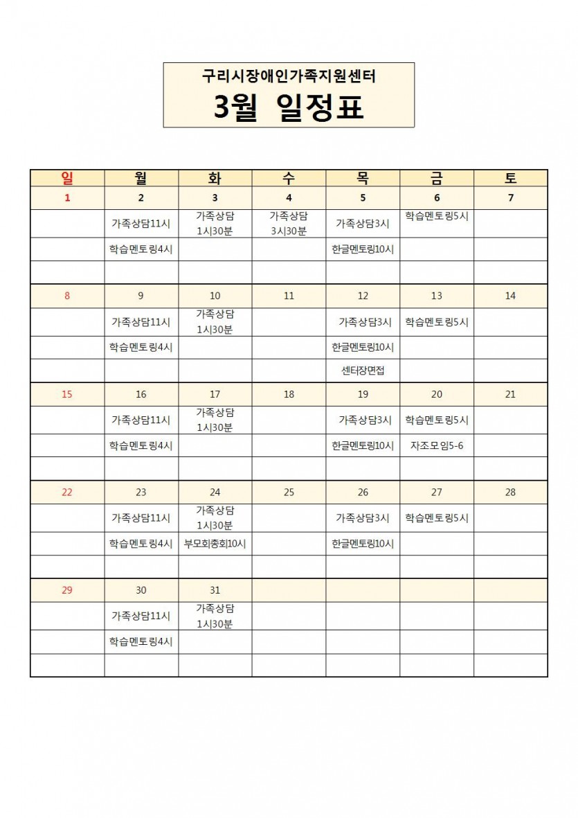 구리시장애인가족지원센터 3월 일정표 공지 페이지 정보 작성자 관리자 댓글 0건 조회 9,717회 작성일 20-02-27 00:18 목록 본문 페이스북 공유 트위터 공유 구글+ 공유 이전글2020년 구리시장애인가족지원센터 사업계획 안내 20.02.27 다음글2020년 구리시장애인가족지원센터 센터장 모집공고 20.02.25 댓글 0 댓글목록 등록된 댓글이 없습니다.
