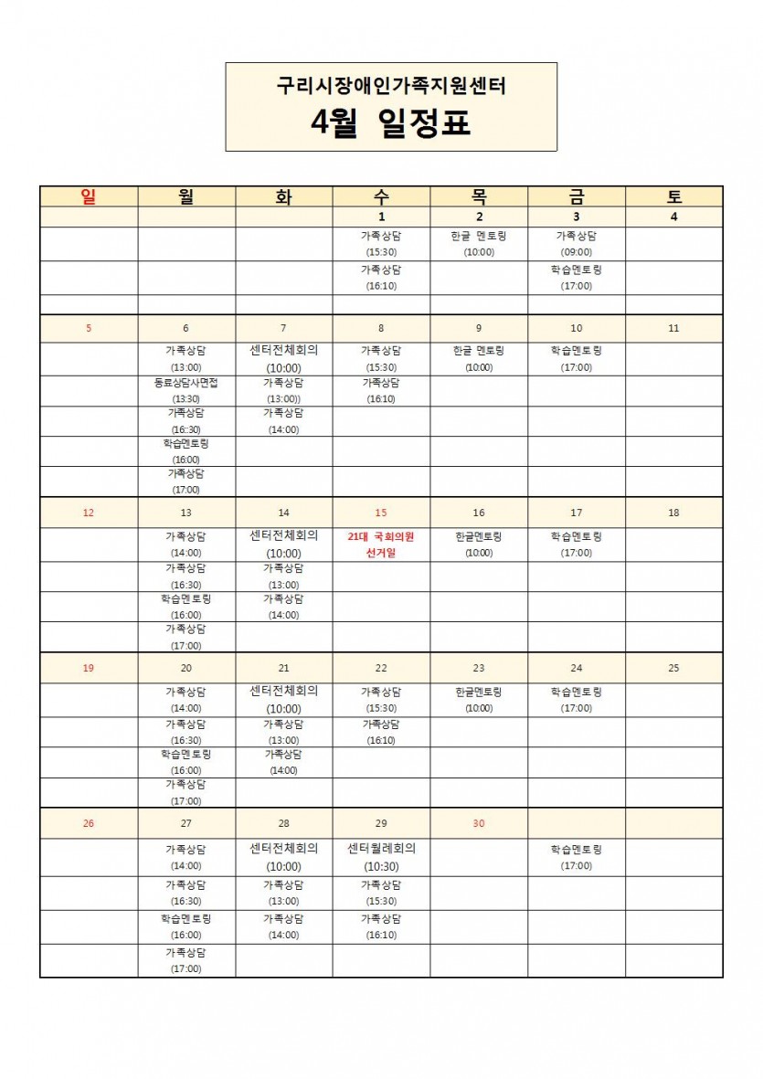 2020년 4월 구리시장애인가족지원센터 일정안내 페이지 정보 작성자 김선규 댓글 0건 조회 9,745회 작성일 20-04-03 00:18 목록 본문 페이스북 공유 트위터 공유 구글+ 공유 2020년 4월 구리시장애인가족지원센터 일정안내입니다. 이전글(긴급) 2020년 구리시장애인가족지원센터 동료상담사 채용 20.04.07 다음글(긴급)2020년 구리시장애인가족지원센터 동료상담사 채용 20.03.27 댓글 0 댓글목록 등록된 댓글이 없습니다.