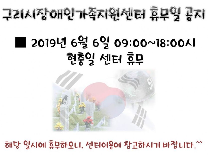 센터 휴무일 공지(6/6) 페이지 정보 작성자 관리자 댓글 0건 조회 8,889회 작성일 19-06-03 00:18 목록 본문 페이스북 공유 트위터 공유 구글+ 공유 6/7 09시에 업무 시작합니다. 이전글7월 센터일정표 19.07.01 다음글6월 센터일정표 19.06.03 댓글 0 댓글목록 등록된 댓글이 없습니다.