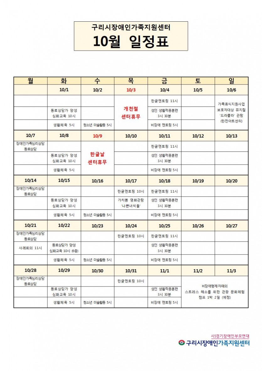 10월 센터 일정표 페이지 정보 작성자 관리자 댓글 0건 조회 9,666회 작성일 19-09-27 00:18 목록 본문 페이스북 공유 트위터 공유 구글+ 공유 10월 센터 일정표 입니다. 많은 관심과 참여부탁드립니다.^^ 이전글센터 휴무일 공지(10/3, 9) 19.09.27 다음글센터 휴무일 공지(9/12~13) 19.09.10 댓글 0 댓글목록 등록된 댓글이 없습니다.