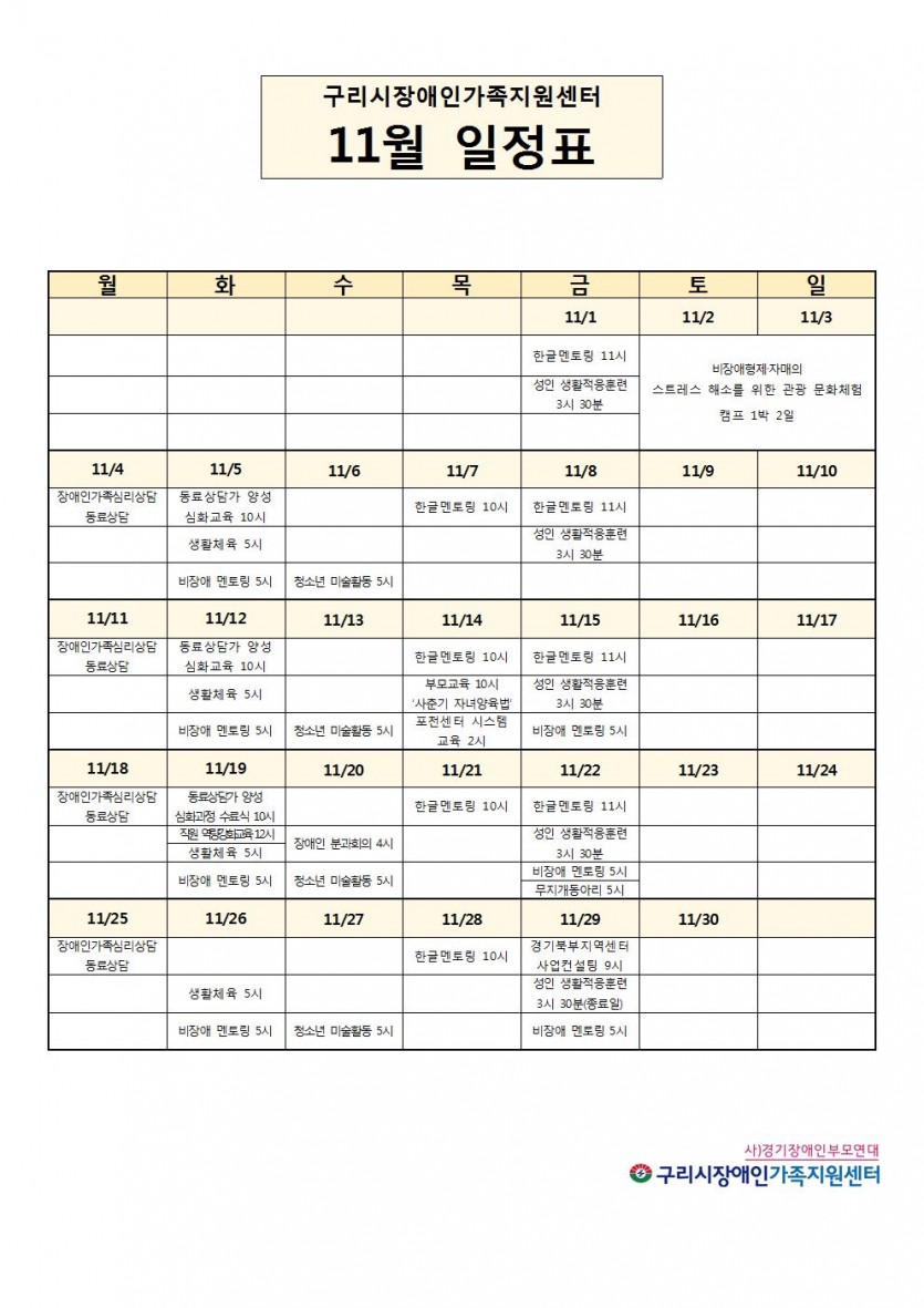11월 센터일정표 페이지 정보 작성자 관리자 댓글 0건 조회 9,756회 작성일 19-11-05 00:18 목록 본문 페이스북 공유 트위터 공유 구글+ 공유 이전글12월 센터일정표 19.12.03 다음글센터 휴무일 공지(10/25, 28) 19.10.24 댓글 0 댓글목록 등록된 댓글이 없습니다.