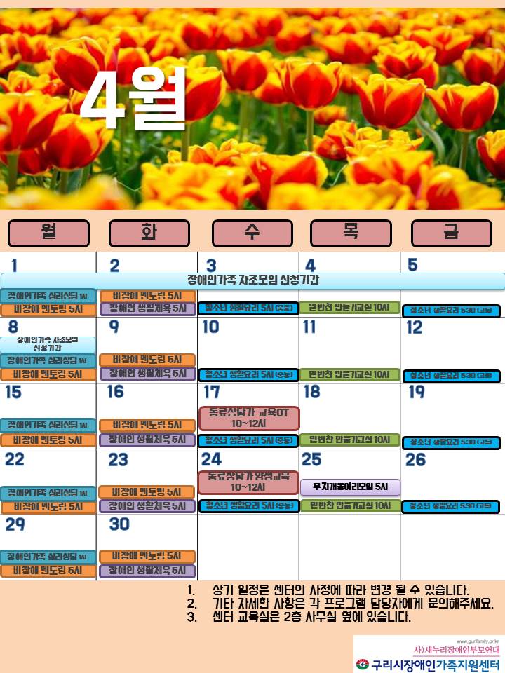 4월 센터일정표 페이지 정보 작성자 관리자 댓글 0건 조회 7,975회 작성일 19-04-02 00:18 목록 본문 페이스북 공유 트위터 공유 구글+ 공유 이전글(모집완료) 장애가족 자조모임 지원사업 참여자 모집(4/1~4/8) 19.04.09 다음글(모집완료) 장애인 생활체육 프로그램 참여자 모집 19.03.21 댓글 0 댓글목록 등록된 댓글이 없습니다.
