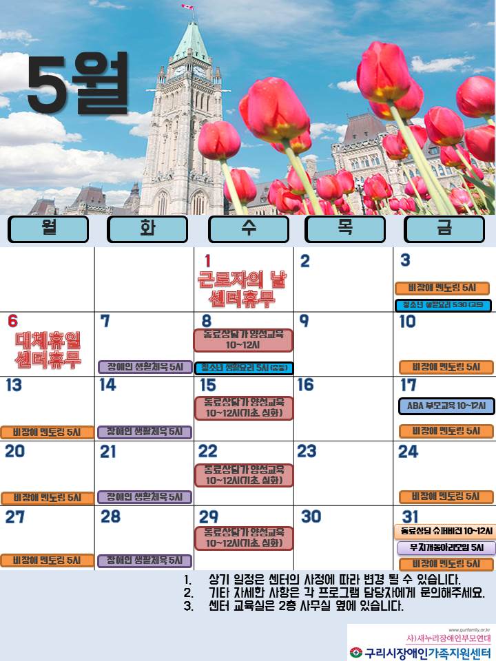 5월 센터일정표 페이지 정보 작성자 관리자 댓글 0건 조회 8,283회 작성일 19-04-26 00:18 목록 본문 페이스북 공유 트위터 공유 구글+ 공유 이전글센터 휴무일 공지(5/1, 6) 19.04.29 다음글(종료) 긍정적 행동지원을 위한 부모특강 19.05.24 댓글 0 댓글목록 등록된 댓글이 없습니다.