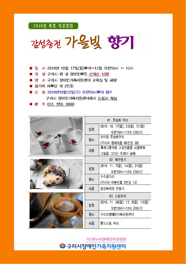 2016년 부모 자조모임 감성충전 가을빛 향기 (사진 첨부) 페이지 정보 작성자 김용기 댓글 0건 조회 9,550회 작성일 16-10-11 00:18 목록 본문 페이스북 공유 트위터 공유 구글+ 공유 이전글발달장애인 자립생활준비 체험홈 프로그램 모집안내 16.12.09 다음글발달장애부모 힐링 백일장 어머니, 나르샤 공고 16.09.28 댓글 0 댓글목록 등록된 댓글이 없습니다.