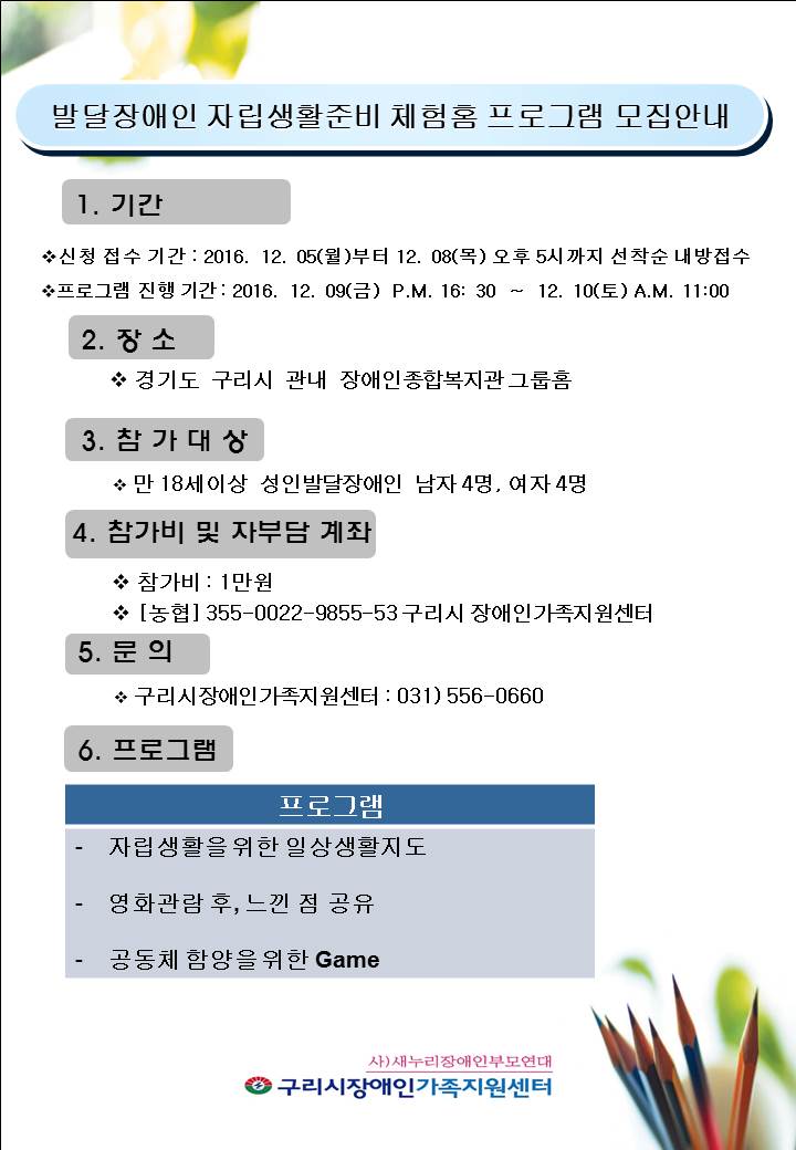 발달장애인 자립생활준비 체험홈 프로그램 모집안내 페이지 정보 작성자 김용기 댓글 0건 조회 9,876회 작성일 16-12-09 00:18 목록 본문 페이스북 공유 트위터 공유 구글+ 공유 이전글사회복지사 채용공고 17.01.03 다음글2016년 부모 자조모임 감성충전 가을빛 향기 (사진 첨부) 16.10.11 댓글 0 댓글목록 등록된 댓글이 없습니다.
