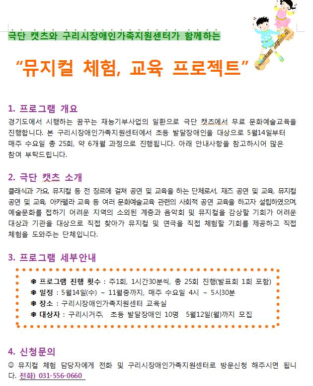  뮤지컬 체험 담당자에게 전화 및 구리시장애인가족지원센터로 방문신청 해주시면 됩니다. 전화) 031-556-0660